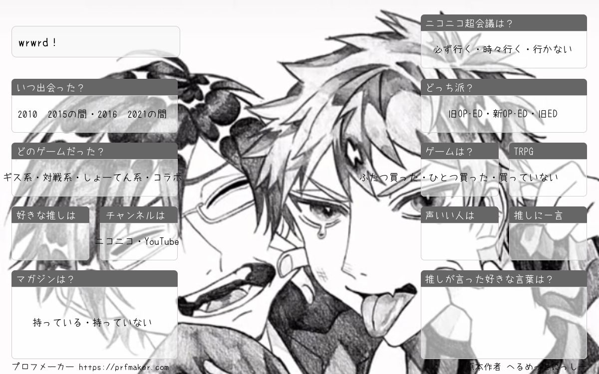 wrwrdにいつ沼ったのか書いてください。自由にしても構いません。質問3は実写、合法、ウツリーグはしょーてん系です。 質問9に関しては好きなTRPGのタイトルを書いてね!