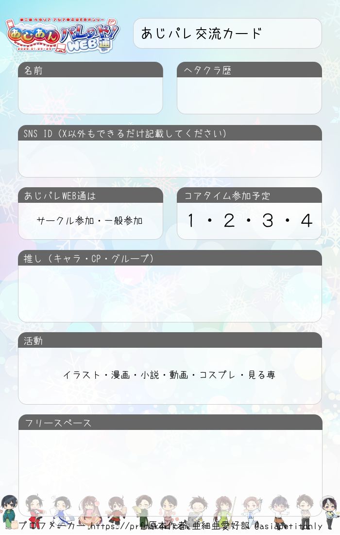 2026年1月23日〜25日開催『あじあんパレード!WEB通』内の交流企画用のプロフカードです。 会期中、各種SNSに #あじパレ交流 のハッシュタグ付きで投稿してください。