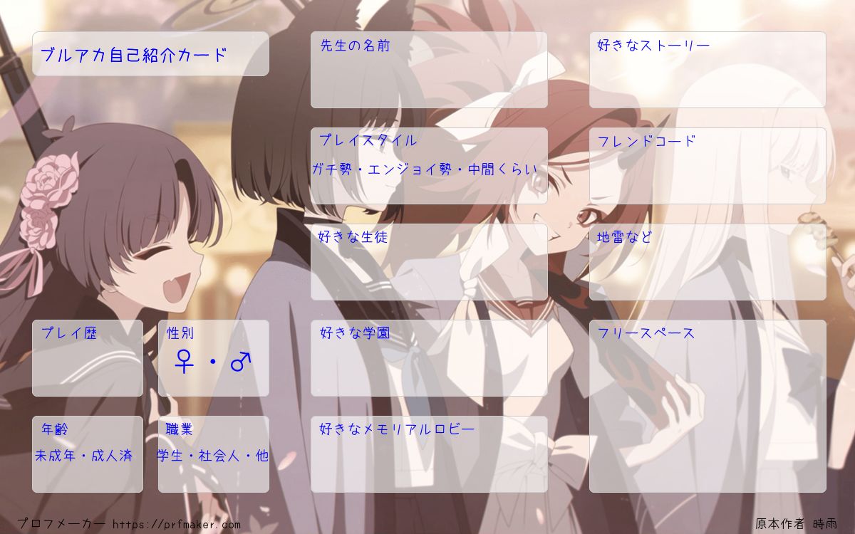 ブルーアーカイブの自己紹介カードです。背景が百花繚乱なので、百鬼夜行、百花繚乱が好きな方、またそれ以外の方でも、お気軽にどうぞ〜。