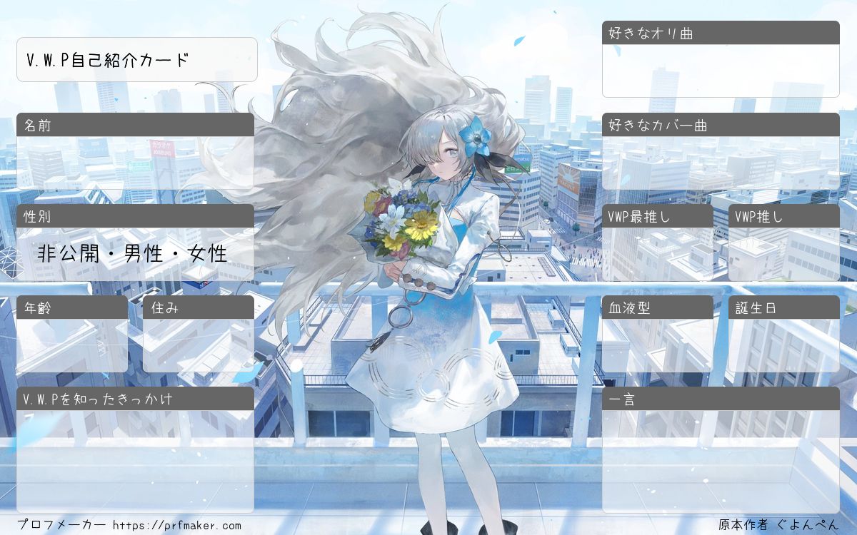 V.W.P(観測者ヰ組向け)の自己紹介カードになります。(※タイトル文字数の関係上、V.W.Pの「 . 」が入っていません、ごめんなさい!) 背景:@FudepenBrushpen 様