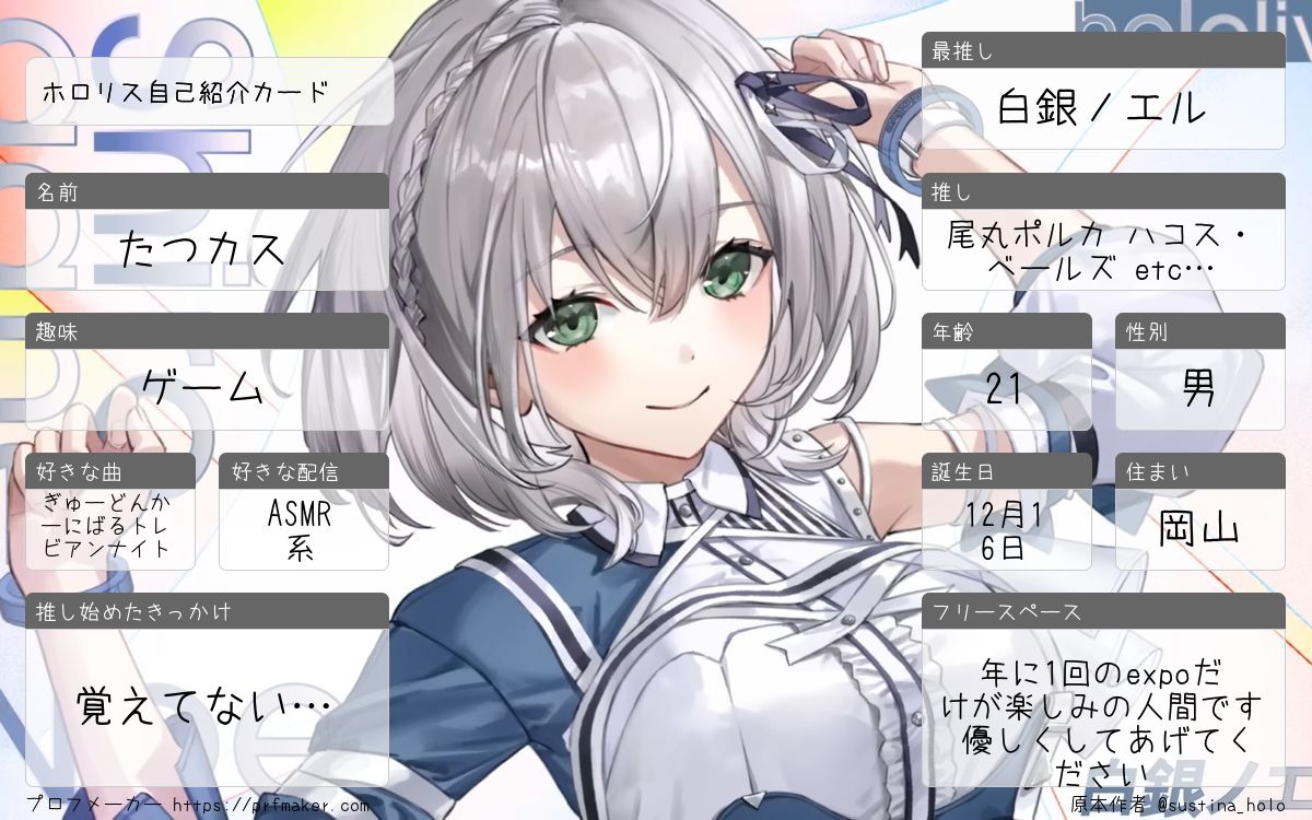 ホロリス自己紹介カード ver.白銀ノエル ホロライブリスナーに向けた自己紹介カードです。 hololive 6th fes. Color Rise Harmony(PV)のイラストを引用しています。 https://youtu.be/xwYrVo4JaaU?si=HEz9BoCI0Oq2R1iu