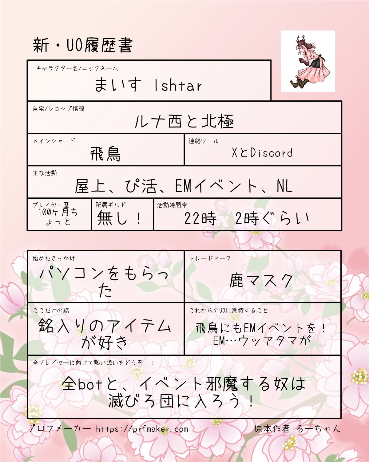 UOプレイヤーの皆様に多数利用していただいたUO履歴書をリニューアルします。 ご自由にお使いいただけますが、作者をSNS等でブロックしている方の利用はお断りします。