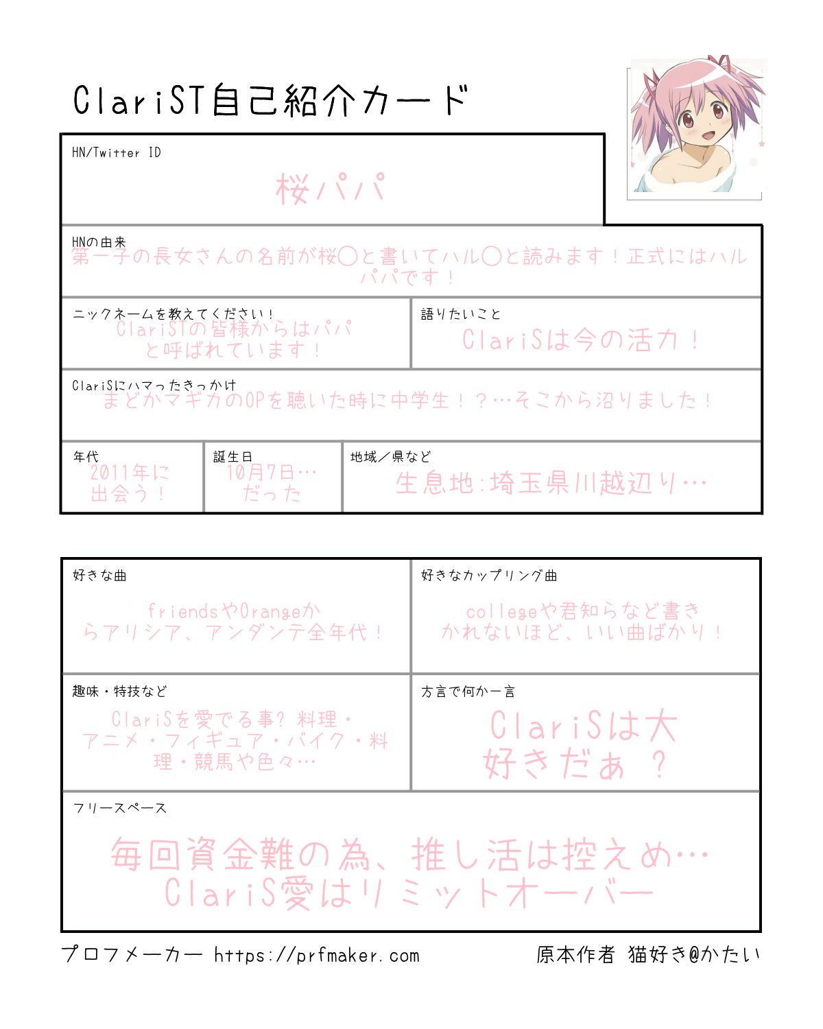 以前、「ClariST 紹介カード」として作ったもののバージョン2です。 LSPからZepp Hanedaにむけて、ClariSファン同士の自己紹介に役立ったらいいなと思って作りました。よかったら、使ってください(*^^*)