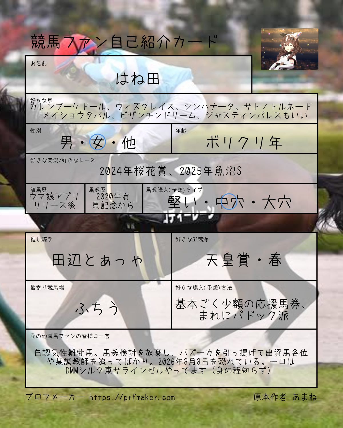 競馬が好きな人、競馬は好きじゃないけど馬術は好きな人、ウマ娘が好きな人のためではなく。自分のために作ったお遊び感覚な自己紹介カード